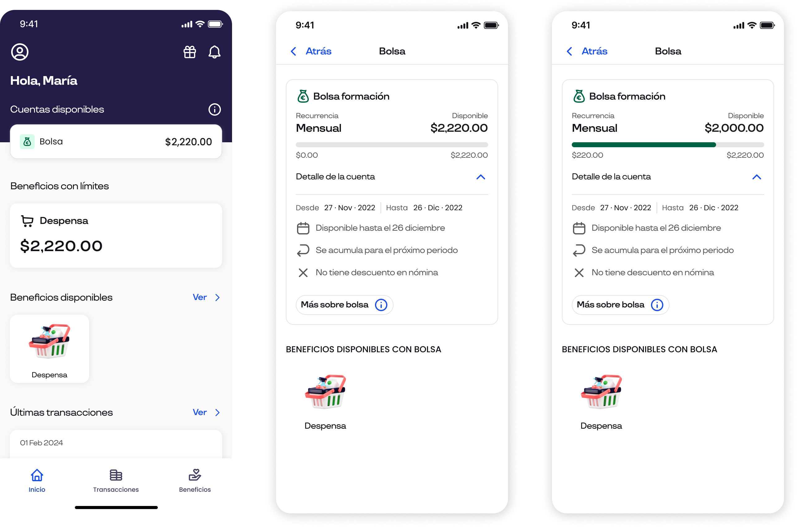 Una bolsa de beneficios es un espacio monedero donde se pone a disposición del colaborador un monto para consumir en ciertos beneficios (como gasolina, teletrabajo, etc.) sin transferencia desde la cuenta de la empresa.